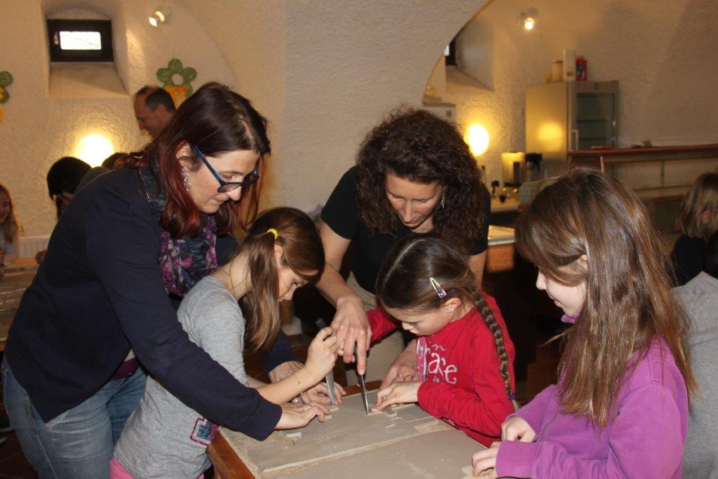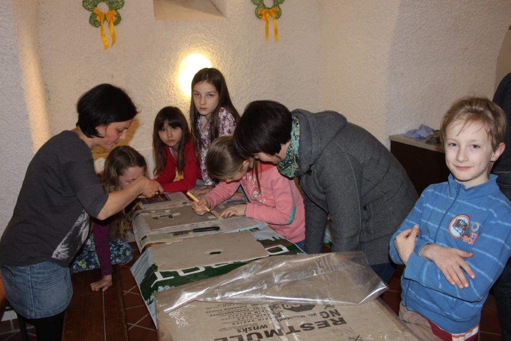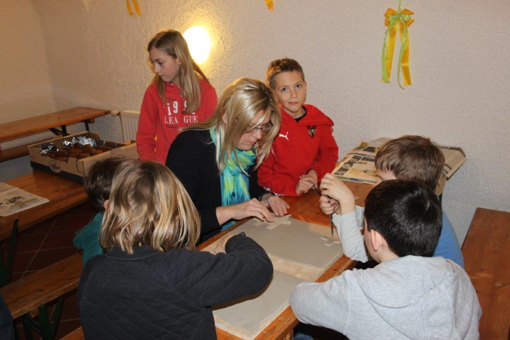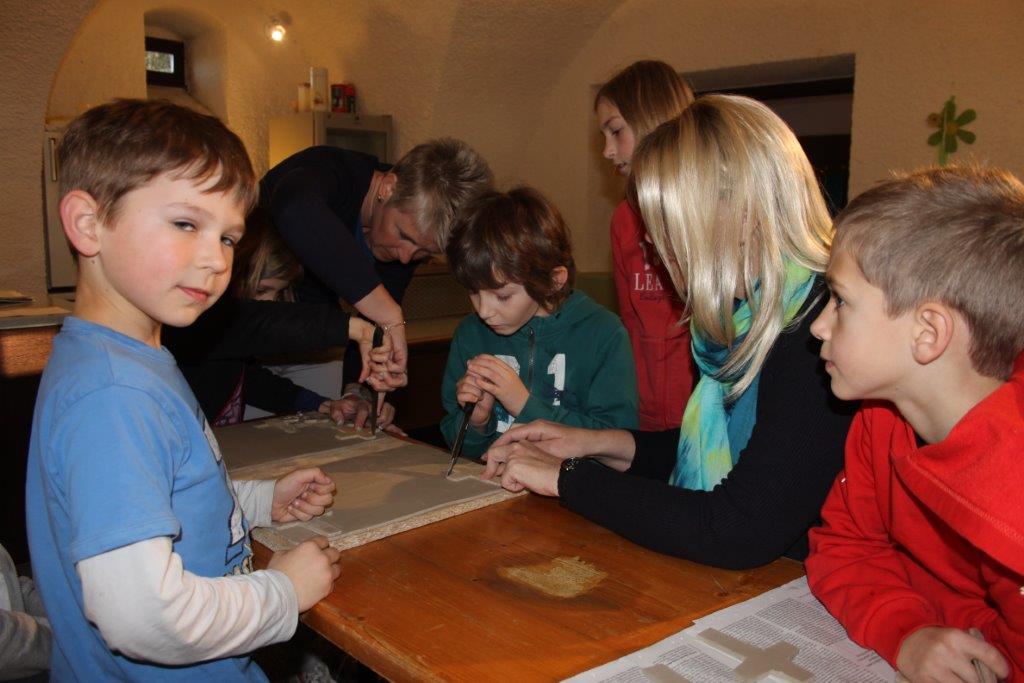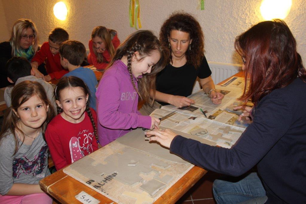 Die Erstkommunionkinder basteln ihre Umhängekreuze